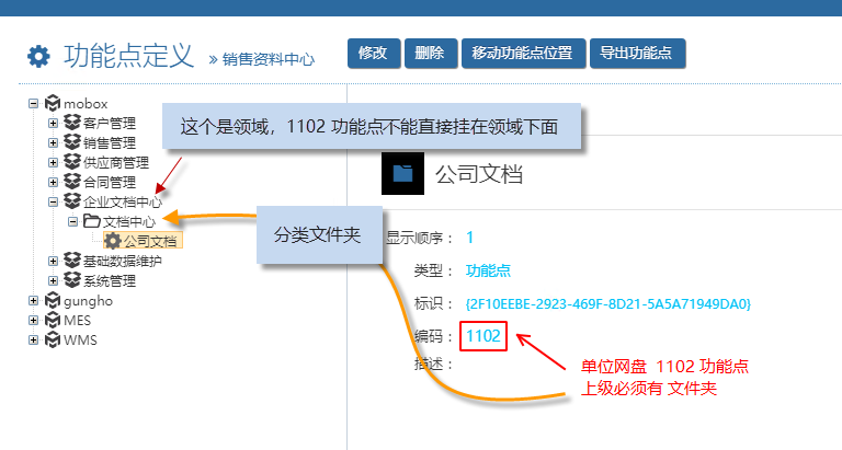 Mobox文檔中心定義 – 1101 及 1102 功能點 注意 2023/09/13 分類:產品中心 實施方案 704 mobox文檔中心可以掛接 1、單位網盤? ? ? ?(1102 功能點) 2、部門網盤? ? ? ?(1102 功能點) 在設置的Mobox文檔中心的時候,功能點不能直接掛到領域下面,而必須在領域下面先建立分類文件夾,之后才能掛接這2個功能點。 若直接掛到領域下面,會出現 而需要改成下圖發設置方法 標簽:方案 上一篇: 低代碼平臺關于數據對象定版后權限控制 下一篇: 關于Gungho及Mobox的授權(臨時授權部分)