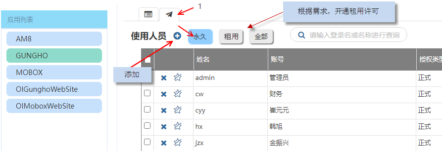 - 全員許可: 授權的人員無需事先設置,使用的時候賬號登錄,自動獲取授權。(注意:授權里面存在租用許可的時候,默認設置到租用許可里面。若沒有就默認是永久授權)
