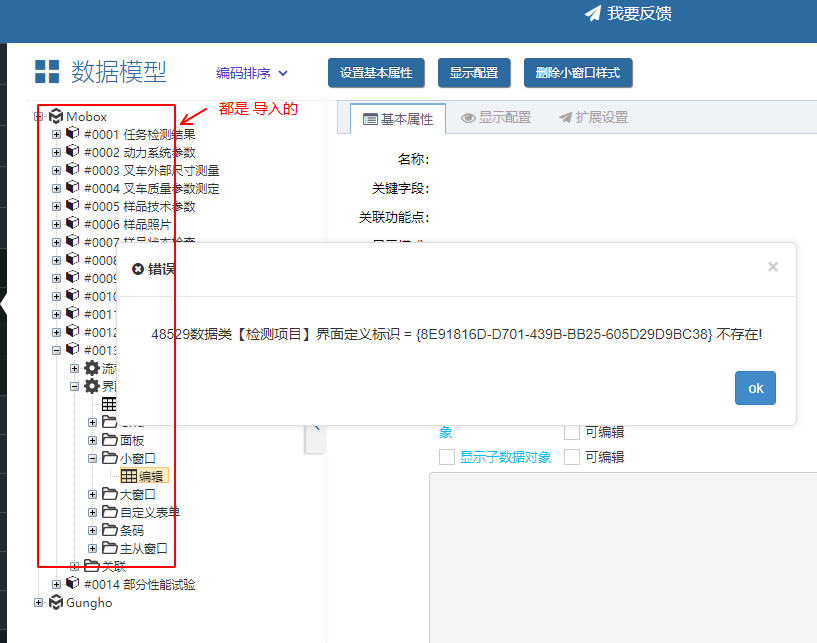 Mobox2數據模型導入后-小窗口或grid點擊報錯(不存在) 2024/02/29 分類:產品中心 問題中心 684 mobox2數據模型導入后 (導入后 提示成功,并沒有提示錯誤) 若點擊模型對象的小窗口,或grid 系統提示錯誤 如 小窗口點擊后報錯 或 grid 點擊后報錯 解決方法 將數據對象重新導入一次 導入后,再次提示 成功 ,如 之后,再點擊前面出錯的小窗口或grid 就正常了 標簽:問題 上一篇: Gungho項目管理系統界面自定義配置 下一篇: Gungho項目擴展屬性二次開發的實現過程