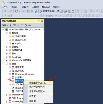 2、在對(duì)象資源管理器列表中展開(kāi)“管理”選項(xiàng)卡,右鍵單擊“維護(hù)計(jì)劃”>“新建維護(hù)計(jì)劃…”