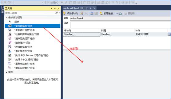3、點(diǎn)擊上方欄的工具箱,選擇“備份數(shù)據(jù)庫(kù)任務(wù)”,用鼠標(biāo)左鍵點(diǎn)住并將其拖到右側(cè)空白處,然后雙擊該任務(wù)