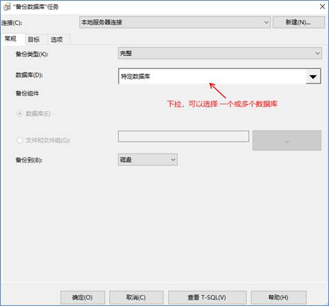 4、在彈出窗口中,先選擇“備份類型”(完整/差異/事務(wù)日志),然后選擇您要備份的具體一個(gè)或多個(gè)數(shù)據(jù)庫(kù)。如您所見(jiàn),您可以選擇備份所有數(shù)據(jù)庫(kù)、系統(tǒng)數(shù)據(jù)庫(kù)、用戶數(shù)據(jù)庫(kù)和特定數(shù)據(jù)庫(kù)。之后再選擇一個(gè)用于存放此備份的目標(biāo)路徑,點(diǎn)擊“確定”