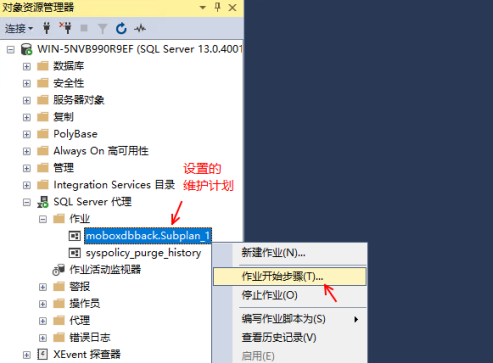 7、設(shè)置完畢之后,返回對(duì)象資源管理器,然后依次展開(kāi)“SQL Server代理”>“作業(yè)”,找到剛剛創(chuàng)建的SQLserver定時(shí)備份數(shù)據(jù)庫(kù)任務(wù)并右鍵單擊它,選擇“作業(yè)開(kāi)始步驟”以啟動(dòng)此任務(wù)